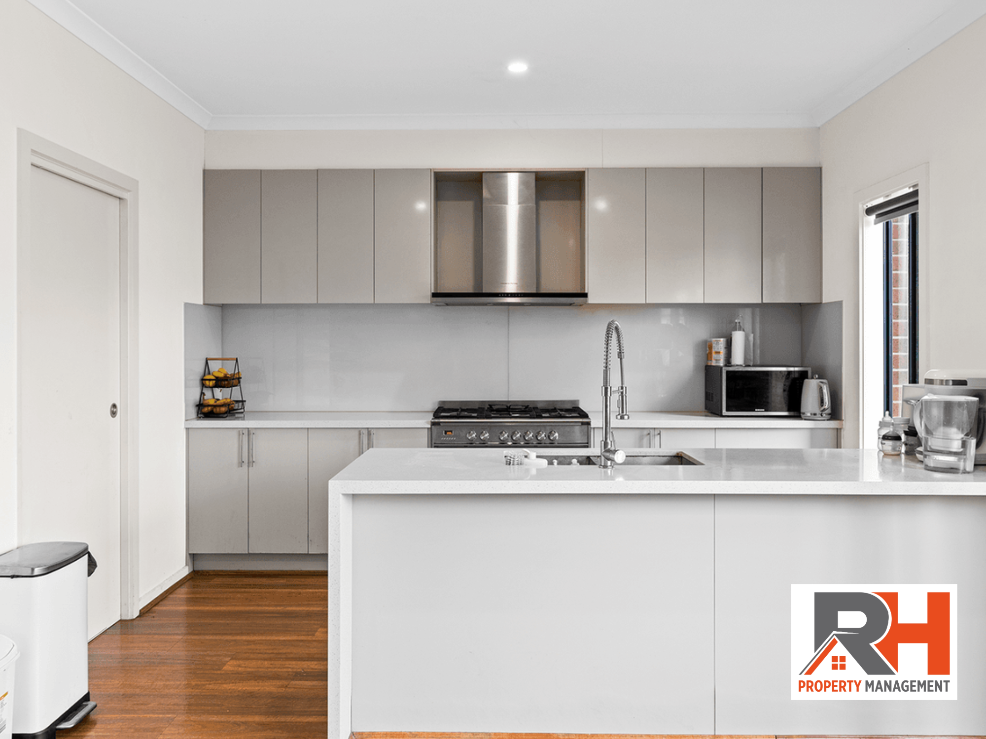 * Modern kitchen with stone benchtops & stainless steel appliances
